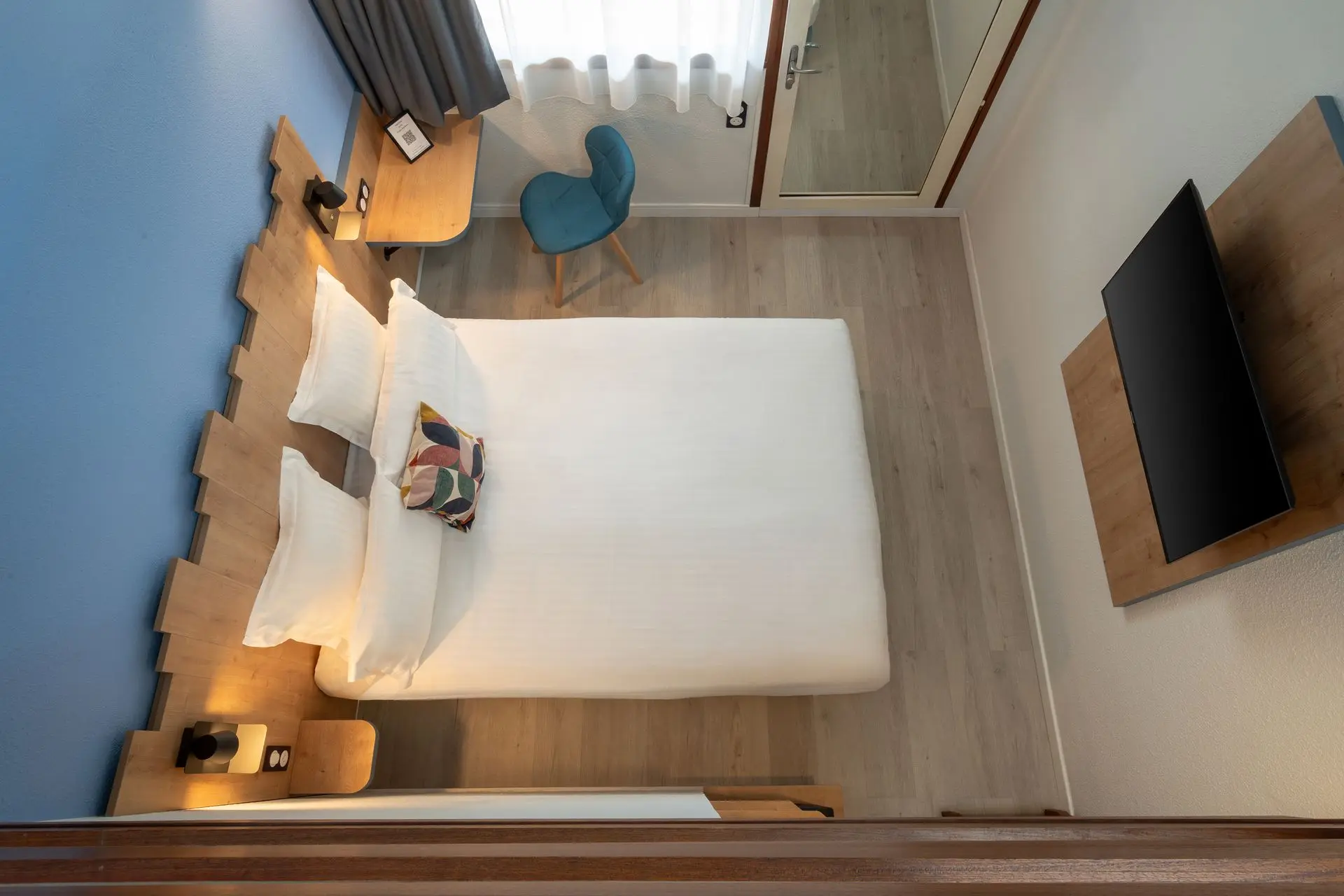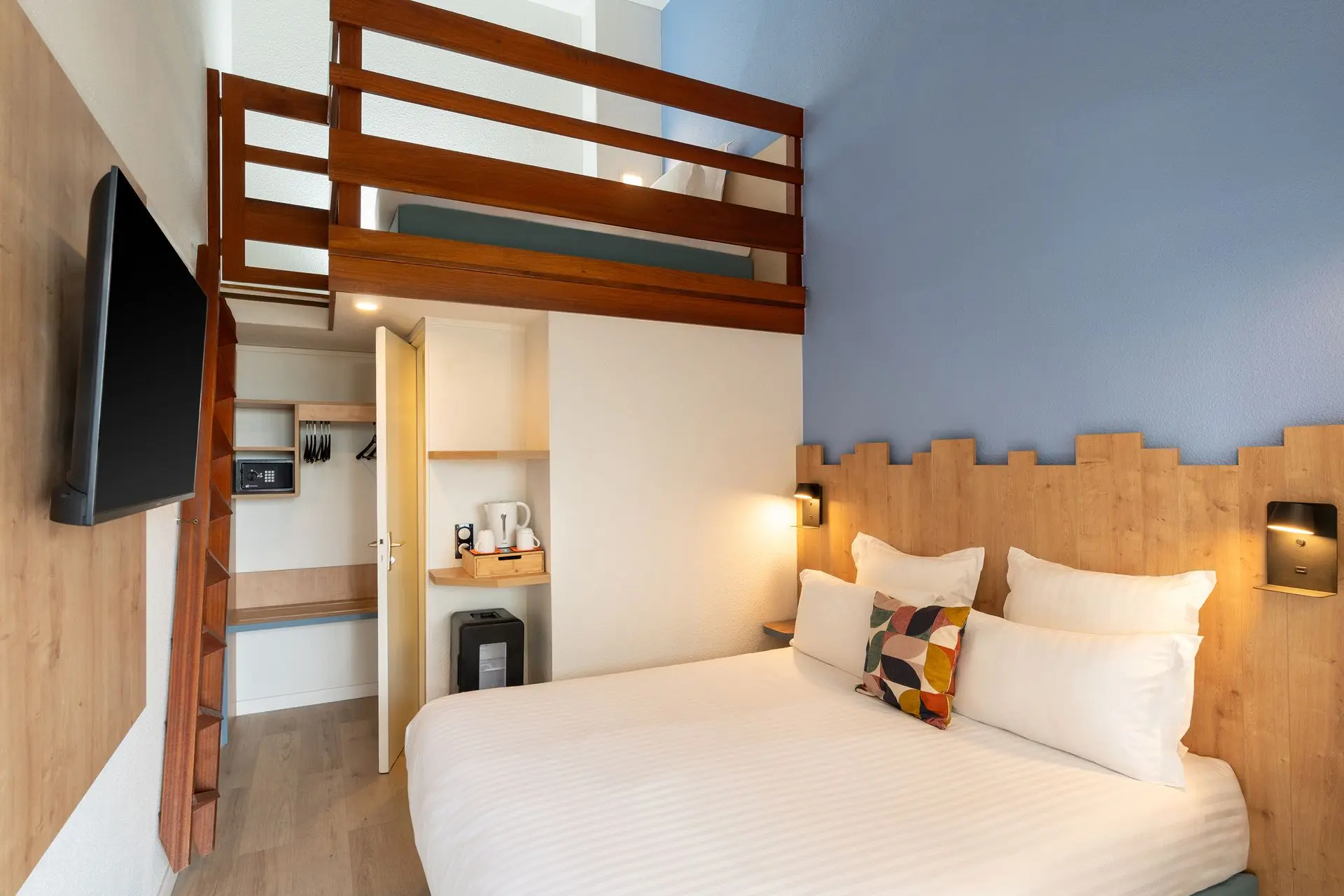 A double bed on the first floor and a single bed on the mezzanine allow each person to enjoy their own space for greater privacy.